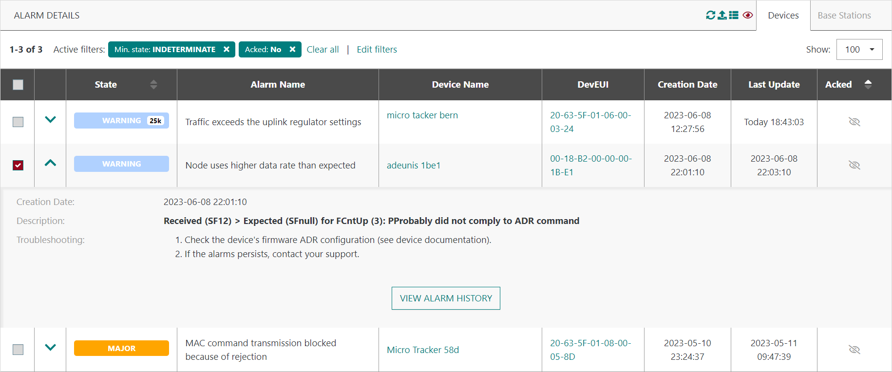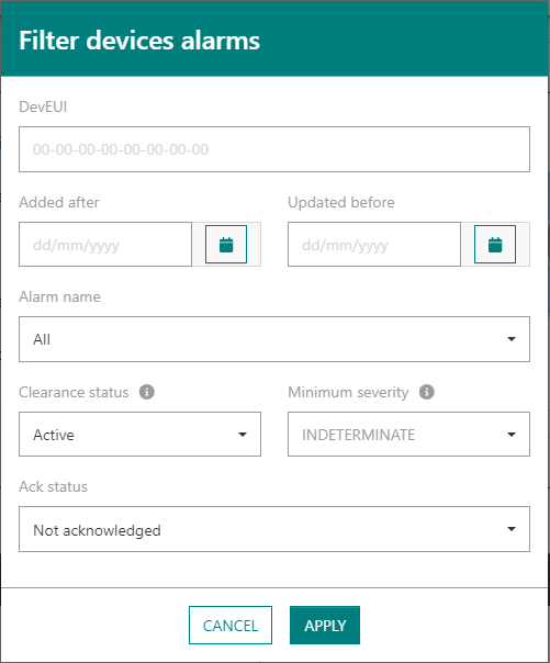 DevEUIRécupère les alarmes déclenchées sur un capteur spécifique en fournissant son DevEUI. Astuces Vous pouvez copier-coller un DevEUI obtenu à partir du trafic affiché par l'application Wireless Logger pour investiguer davantage un capteur.