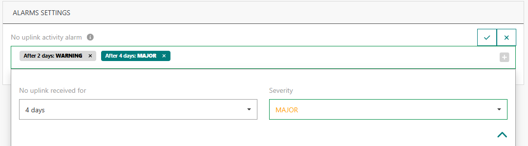 Si vous avez un rôle de gestionnaire des capteurs, groupes multicast et connexions, vous pouvez définir une alarme d'inactivité par capteur et définir un ou deux seuils pour déclencher cette alarme. Par exemple, déclencher l'alarme avec la sévérité AVERTISSEMENT après 2 jours d'inactivité, puis augmenter la sévérité à MAJEUR après 7 jours d'inactivité. Pour plus de détails sur l'alarme "Aucune activité d'uplink", voir Aucune activité d'uplink.