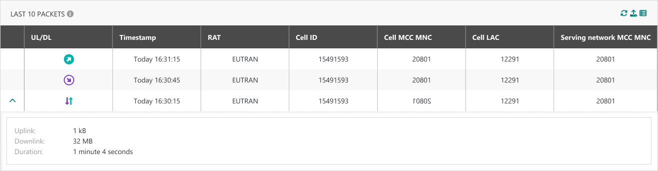 Dans la colonne UL/DL, vous pouvez voir une représentation graphique du type de paquet. Survolez chaque badge avec la souris pour obtenir plus de détails sur la valeur affichée. Pour en savoir plus, consultez la section Analyse du trafic cellulaire.
