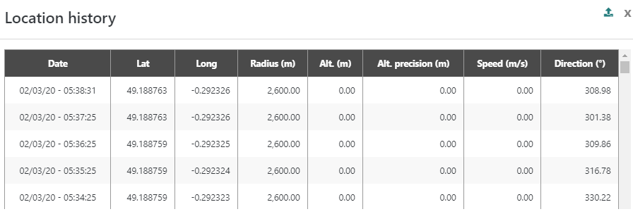 Une nouvelle fenêtre s'ouvre, affichant l'historique de localisation selon l'exemple suivant :