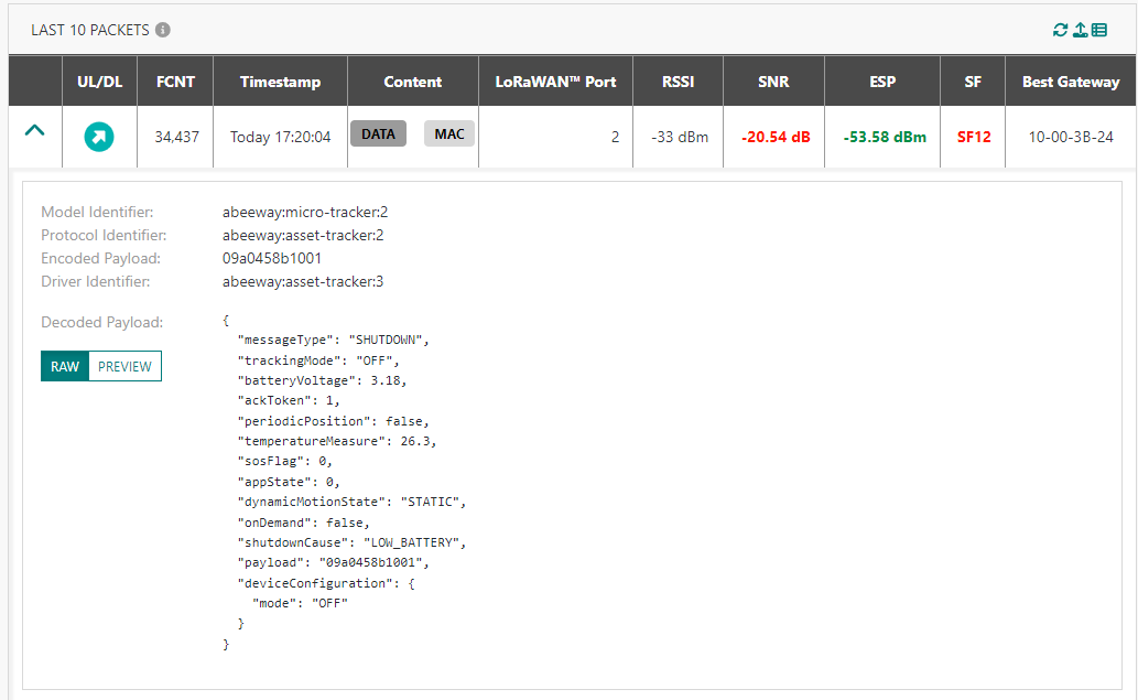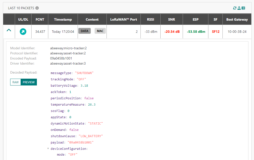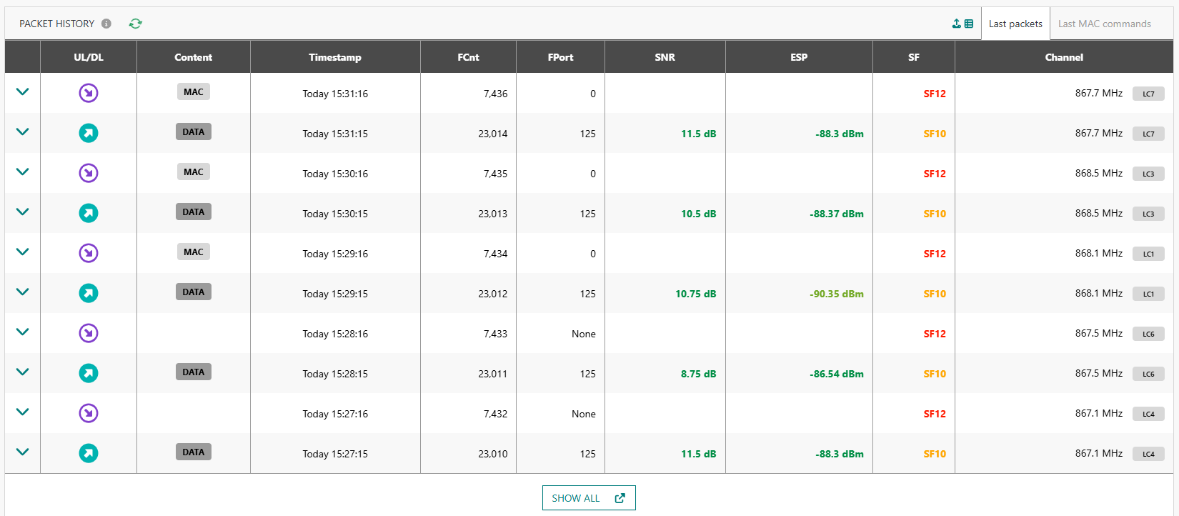 Vous pouvez consulter l'historique des 10 derniers paquets uplink/downlink échangés entre le capteur et le réseau depuis la page détaillée de chaque Capteur. De plus, vous pouvez voir les payloads décodées de vos données applicatives dans cette même vue.