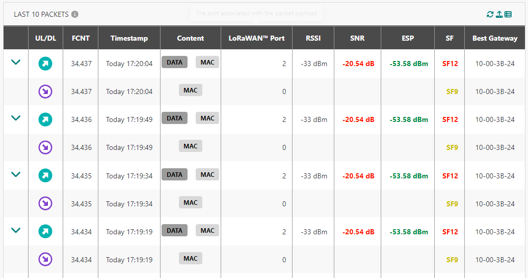 astucePour en savoir plus sur le RSSI, le SNR et l'ESP, consultez Métriques radio LoRaWAN. Les codes couleur associés sont décrits ici.