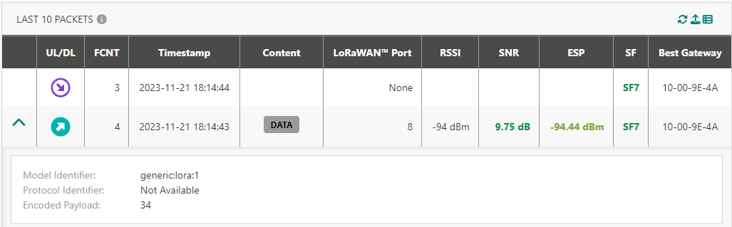 Dans les colonnes UL/DL et Contenu, vous pouvez voir une représentation graphique du type et du contenu du paquet. Survolez chaque badge avec la souris pour obtenir plus de détails sur la valeur affichée. Pour en savoir plus, consultez Paquets LoRaWAN® uplink et Paquets LoRaWAN® unicast en downlink.