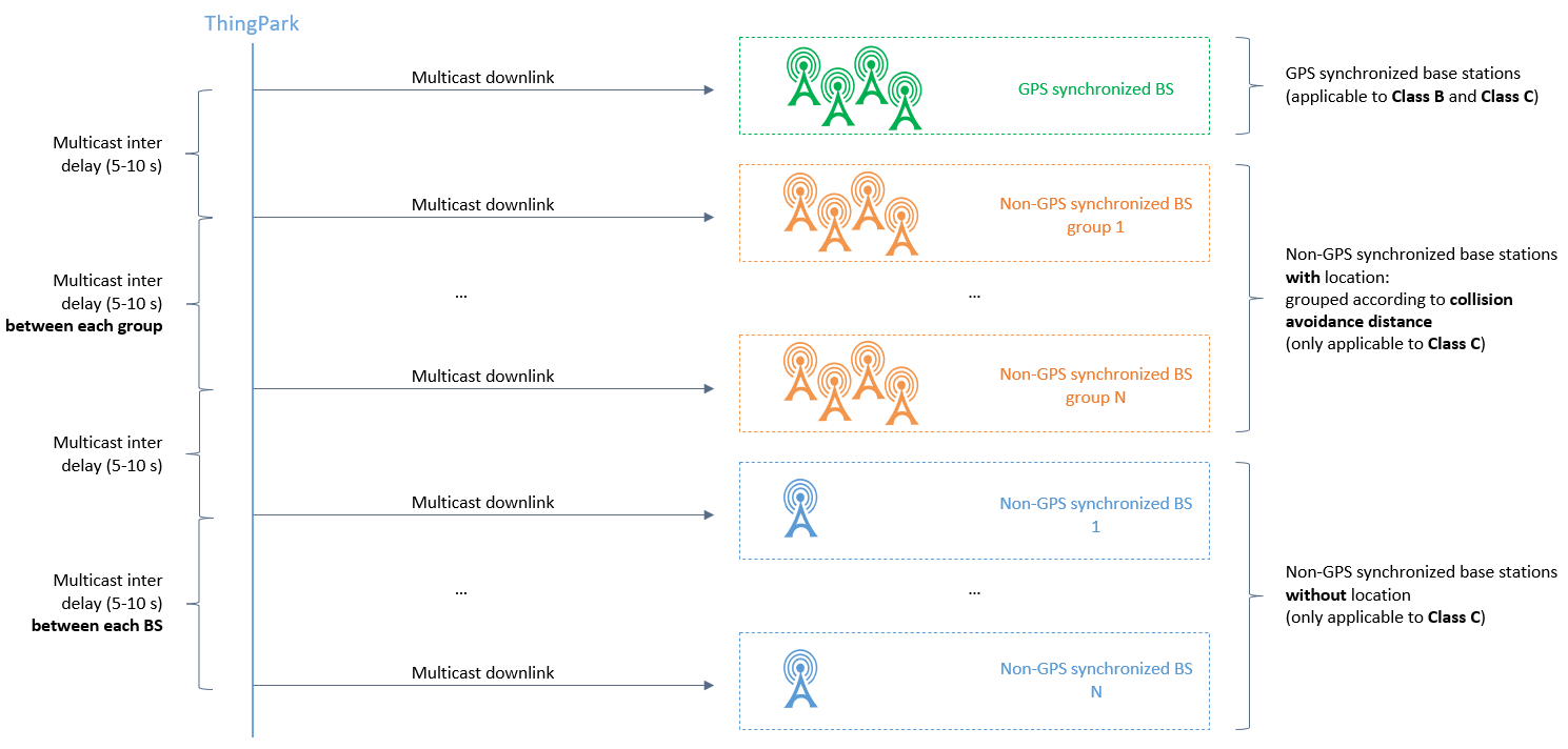 Étant donné que le fonctionnement en classe B implique que les passerelles sont parfaitement synchronisées par GPS, une trame multicast en downlink peut être transmise de manière synchronisée sur toutes les passerelles sans aucun risque de collision, en tirant parti de l’effet d’interférence constructive qui est déjà le cas pour la transmission synchronisée des signaux beacon.