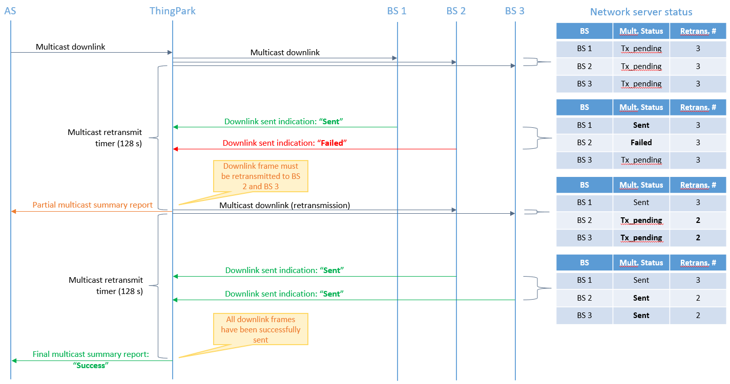 Si la première transmission planifiée par le network server échoue pour certaines passerelles (éventuellement après que la passerelle a réessayé de manière autonome la transmission avant d’abandonner), le network server doit réessayer la transmission de la trame multicast jusqu’à ce que le nombre maximal de tentatives soit atteint (fixé par défaut à 3 tentatives).