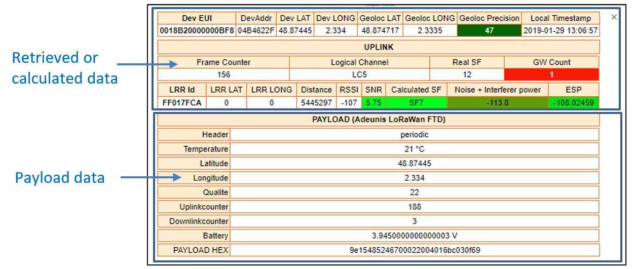 Les données calculées par le solveur de géolocalisation LoRa sont les suivantes :
