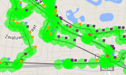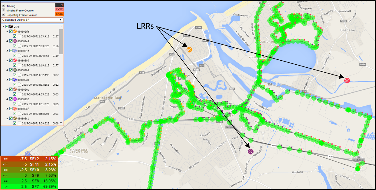 La vue carte se compose des emplacements LRR ainsi que des paquets de capteur, chaque paquet est étiqueté avec un carré coloré
