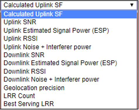 En plus des métriques radio typiques transmises du LRR au LRC (par exemple, UL RSSI, facteur d'étalement UL, UL SNR...), l'outil Network Survey permet de calculer et d'afficher des métriques radio supplémentaires, sélectionnables depuis un menu déroulant :