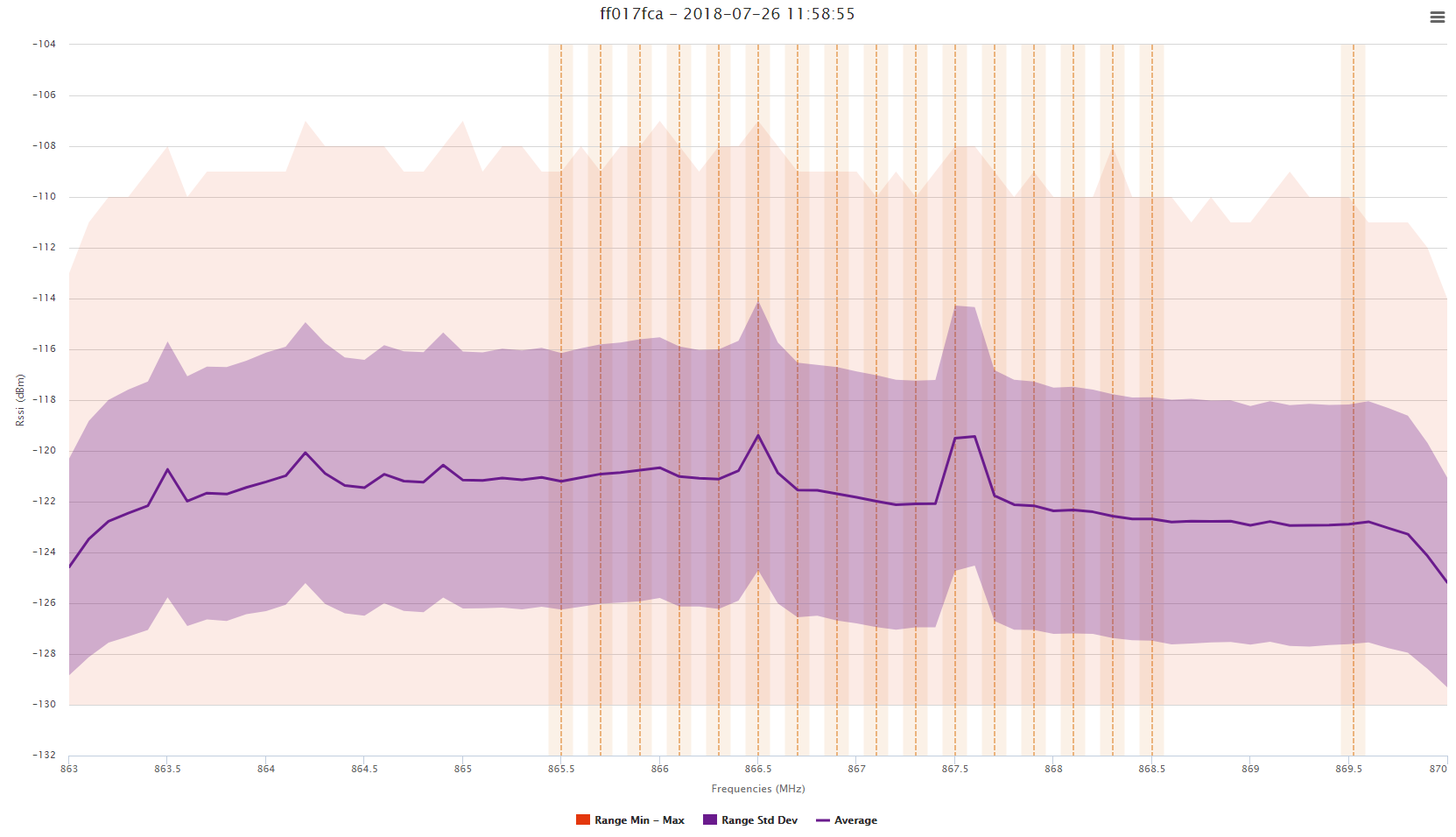 Sélectionnez Calculer l'écart type si des valeurs d'écart type sont nécessaires, le graphique affichera alors une zone violette représentant la moyenne RSSI +/- l'écart type.