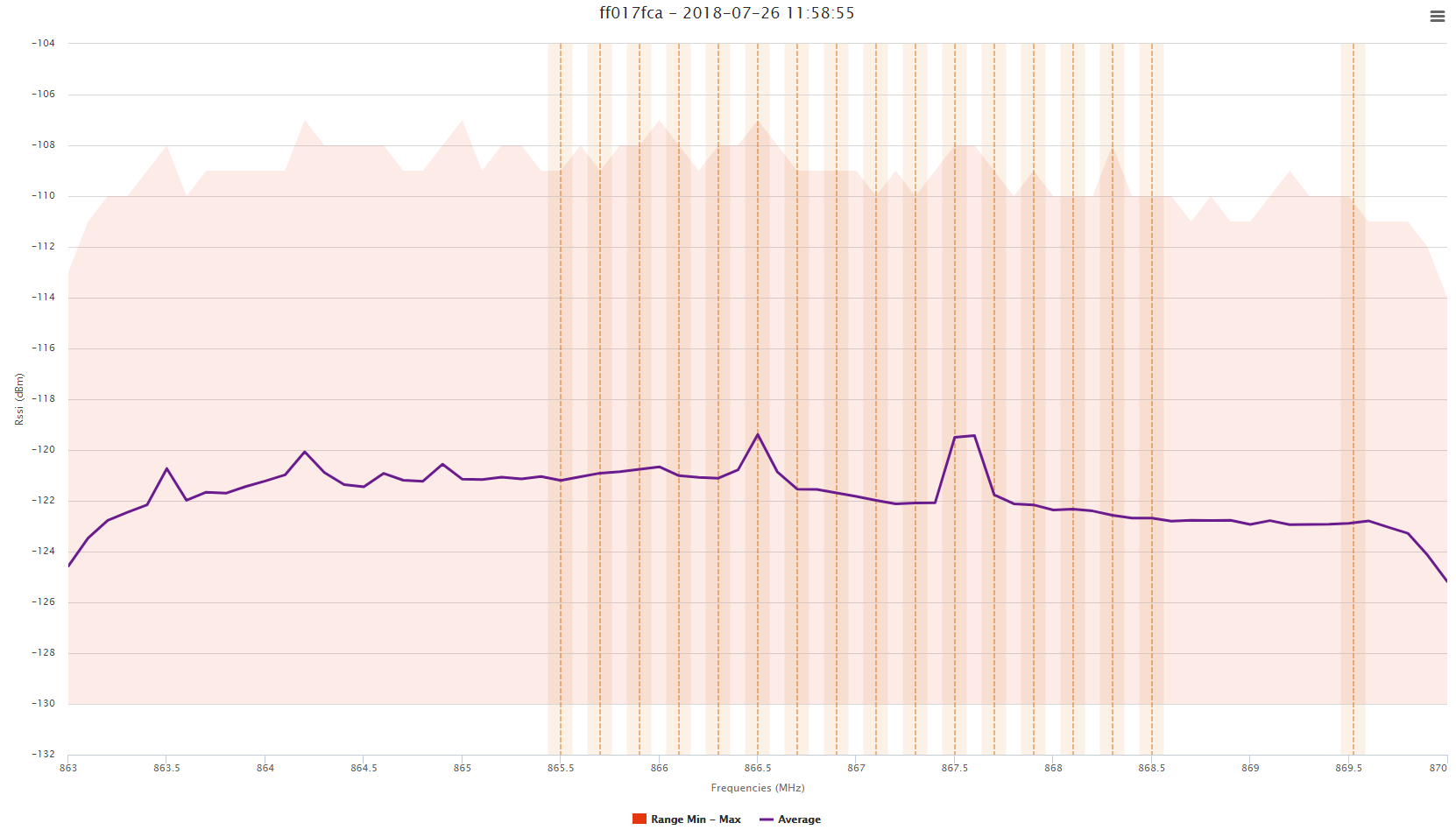 Les valeurs de RSSI minimales et maximales obtenues pour chaque plage de fréquences sont également affichées.