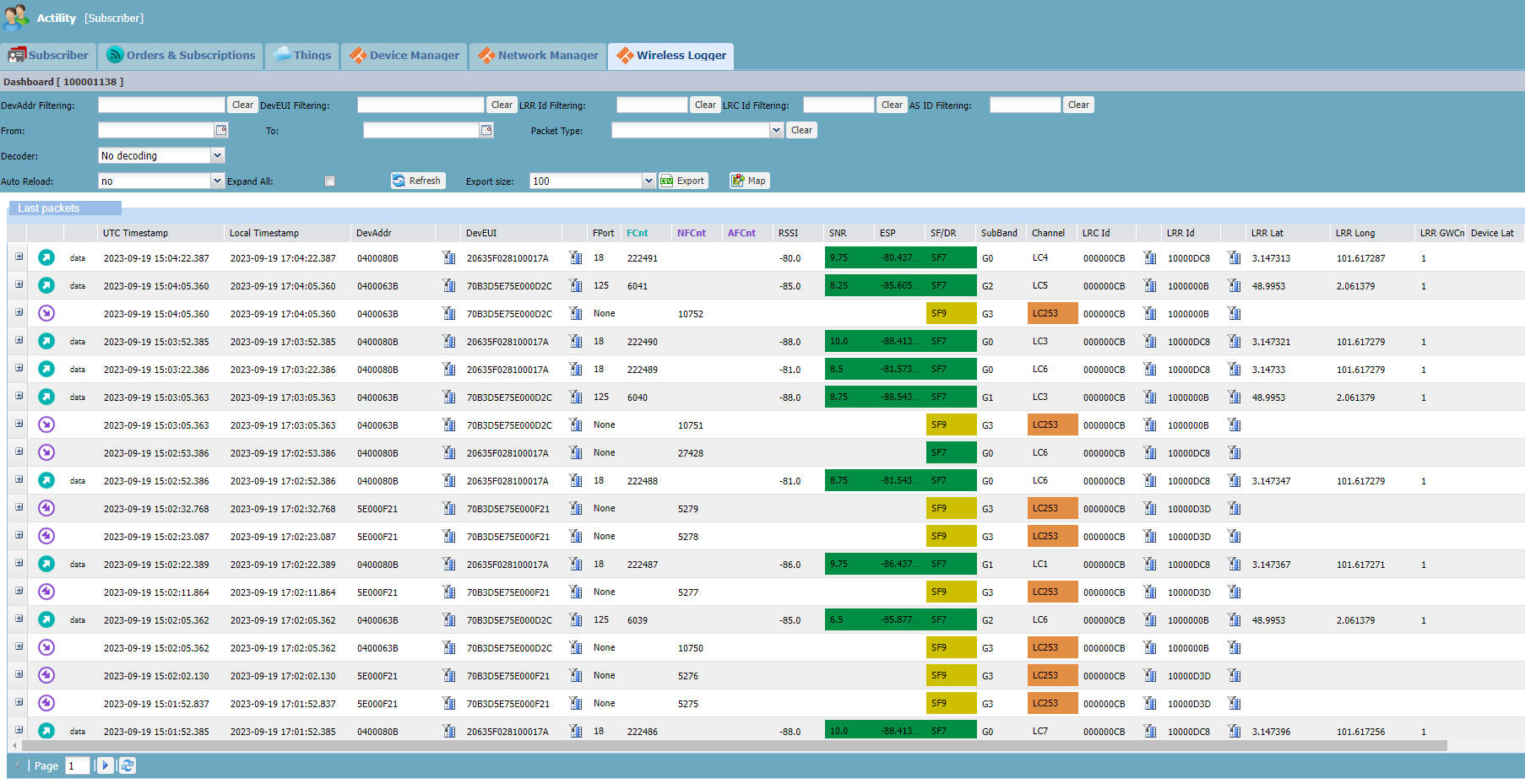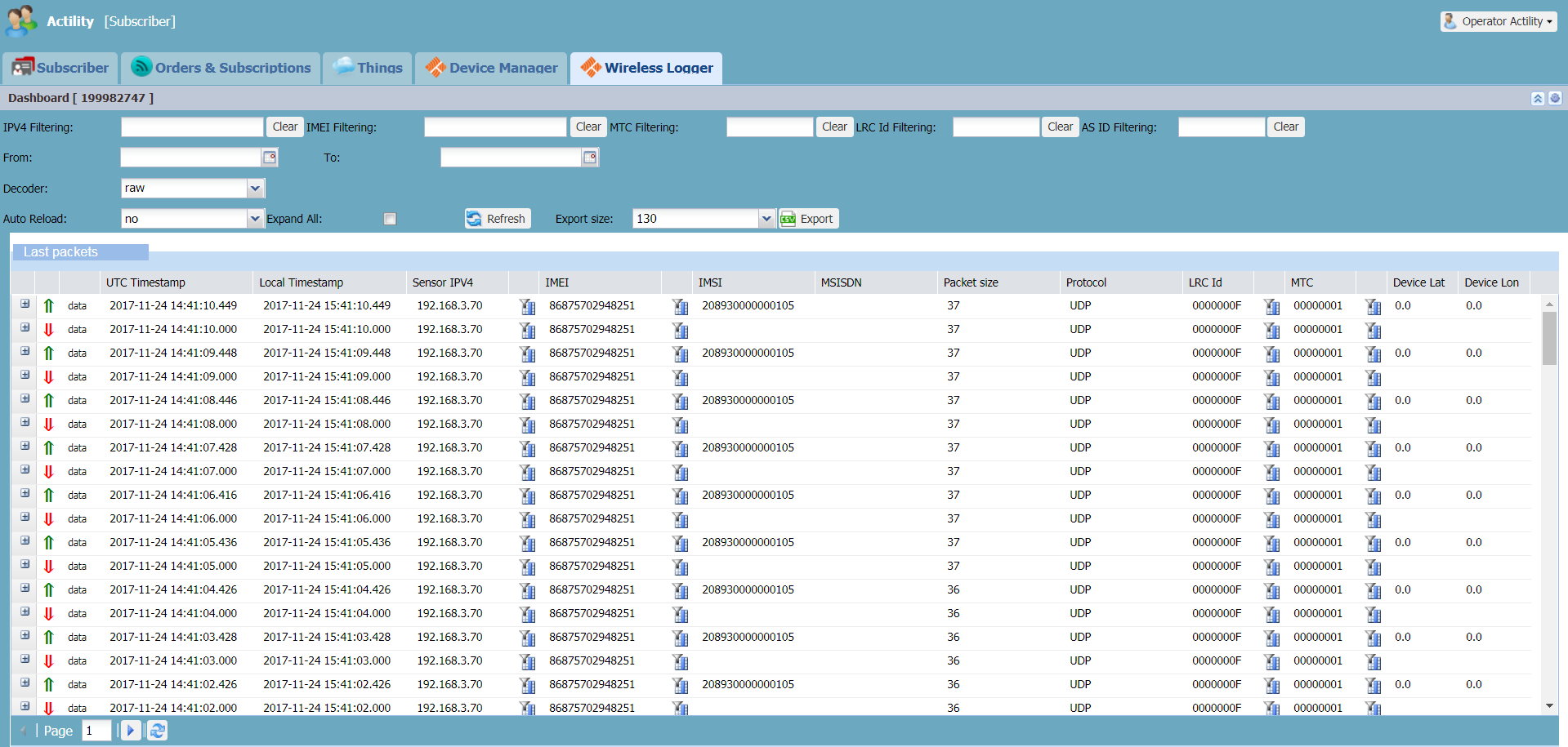 - Si le Wireless Logger est attaché à un compte partenaire réseau, les 100 derniers paquets échangés avec les passerelles provisionnées dans Network Manager apparaissent.