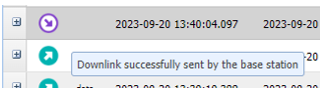 | Paquet unicast downlink envoyé pour un uplink répété (échec) | Une tentative de transmission de paquet downlink a été effectuée en réponse à un paquet uplink répété qui n'est pas visible dans WLogger (en raison de la déduplication des paquets). Le point rouge indique que le paquet n'a pas été transmis avec succès par voie hertzienne, avec la cause de l'échec correspondante indiquée dans le panneau extensible. |
