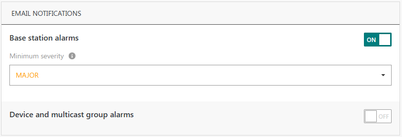 Vous pouvez vous abonner aux notifications par e‑mail pour les alarmes de passerelle et pour les alarmes de capteur et de groupe multicast séparément. Lorsque l’abonnement est activé, vous pouvez choisir le niveau minimal de gravité des alarmes pour lequel vous souhaitez être averti. Les notifications par e‑mail sont envoyées à l’adresse e‑mail configurée dans votre profil.